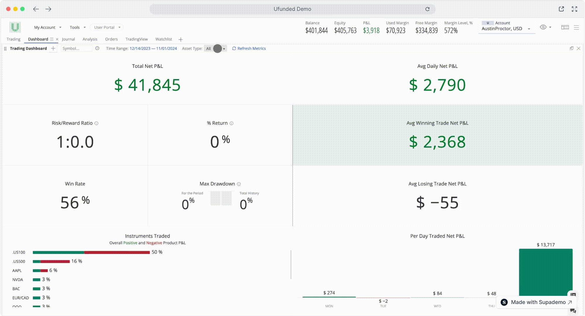 The trading dashboard can be filtered by specific instruments to assess trading performance at an individual instrument level. To filter by instrument, enter the instrument in the search bar at the top of the dashboard.