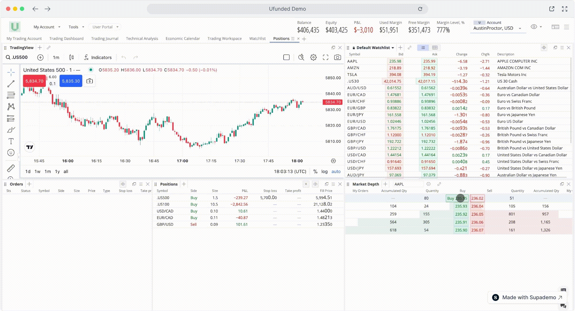The Market Depth chart displays transactions for specific equities, along with number of shares transacted, accumulated quantities, and orders specific to the trader. Trades can be executed from the Market Depth chart by clicking the Bid or Ask buttons in the middle of the Market Depth chart.